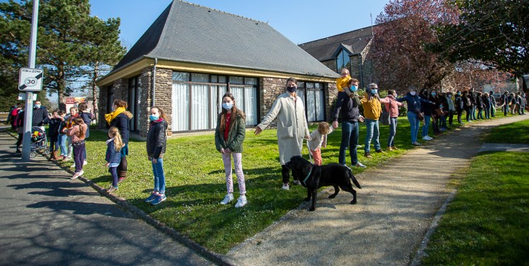 Ce samedi 20 mars, à 11heures, une centaine d’habitants de Laillé a répondu avec enthousiasme à l’appel de l’Association pour réaliser une chaîne humaine autour de la Mairie pour soutenir une famille tchétchène qui a reçu une OQTF (Obligation de Quitter le Territoire Français) malgré le fait qu’elle est arrivée en France depuis plus de 7 ans et que les 4 enfants sont scolarisés dans les établissements scolaires lailléens.
