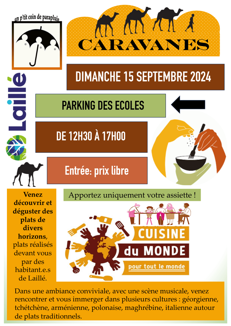 Dimanche 17 Septembre 2023 à partir de 12h30, venez découvrir les repas réalisés par les familles de la commune de Laillé. Rendez-vous sur le parking de la Mairie. Des plats maghrébins, turcs, géorgiens, tchéchènes, arméniens, polonais, congolais, italiens et … bretons vous seront servis. Prix d’entrée libre. Venez uniquement avec votre assiette. Une scène musicaleLire la suite « Caravanes »