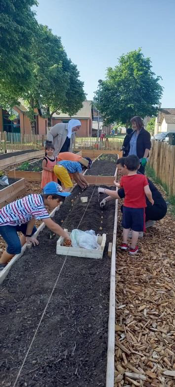 - solidaire : en faisant participer les familles migrantes et les familles en difficultés pour une meilleure intégration dans la vie et l’espace communal, et en leur distribuant les récoltes.