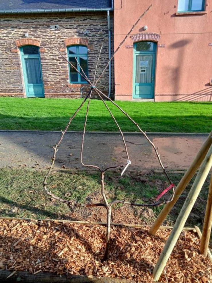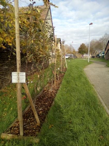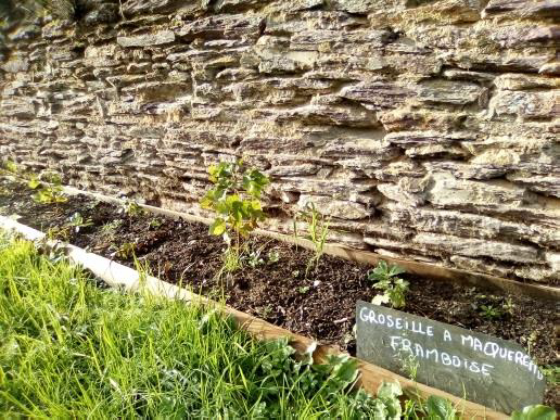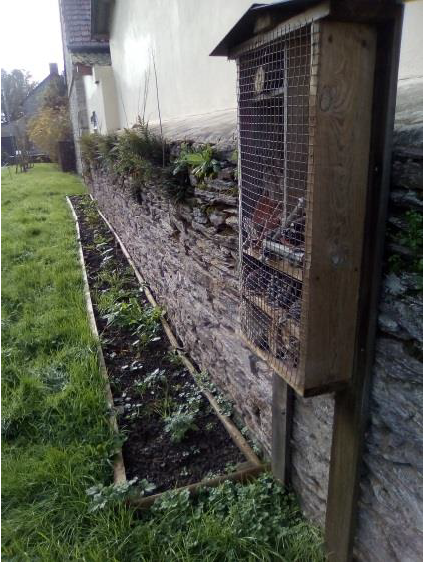 6 arbres palissés (poire/pomme), 5 fruitiers en quenouilles (pêche/pomme…), bac à petits fruits rouges, hôtel à insectes.